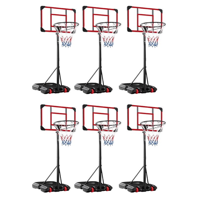This adjustable basketball hoop may help young players ages eight and up develop their skills, as the rim height can be lowered or raised to suit different abilities. Constructed from heavy-duty steel and featuring a durable backboard with an all-weather net, it is designed to be weather-resistant for long-lasting use. Its portable design, which includes two wheels on the base, may help make it easy to move between locations. The sturdy base can be filled with sand or water for stability and includes a built-in groove that may help with convenient basketball storage.
